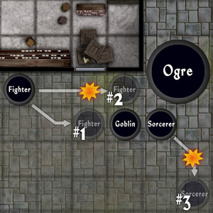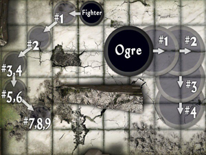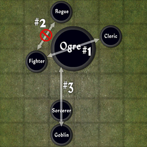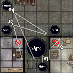 In this combat, the fighter and the sorcerer fight an ogre and his goblin buddy. #1: The fighter can safely approach this way without provoking an attack of opportunity, as he does not pass through a square threatened by the ogre (who has 10 feet of reach) or the goblin. #2: If the fighter approaches this way, he provokes two attacks of opportunity since he passes through a square both creatures threaten. #3: The sorcerer moves away using a withdraw action. The first square she leaves is not threatened as a result, and she can thus move away from the goblin safely, but when she leaves the second square, she provokes an attack of opportunity from the ogre (who has 10 feet of reach). She could instead limit her movement to a 5-foot step, as a free action, and not provoke any attacks of opportunity. |
